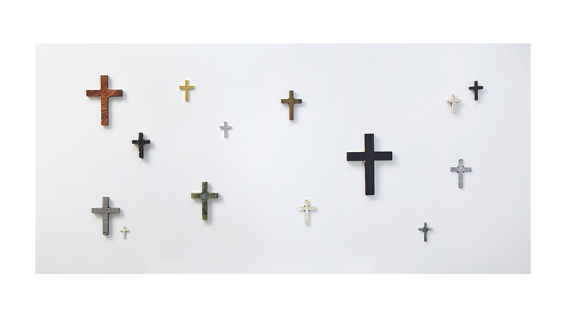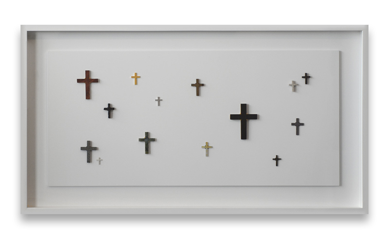 Brass, silver, 24ct gold leaf, palladium leaf, greenstone, ebony, lignum vitae, cedar, lead, pumice, jet, mother of pearl, ivory (recycled piano key), lava and basalt