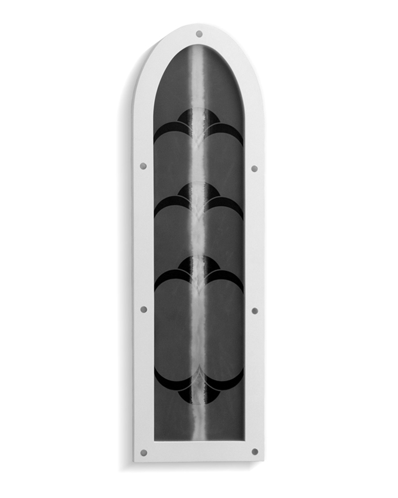 Chinagraph, ink on paper, sand-blasted glass, brass-and-steel rivets and lacquered custom wood
